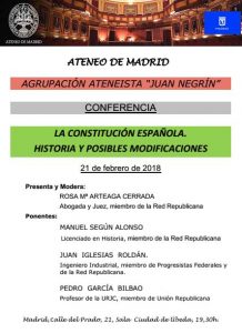 El próximo 21 de febrero y en colaboración con la agrupación ateneísta «Juan Negrín» se celebrará la conferencia titulada «La Constitución Española. Historia y posibles modificaciones».